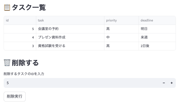 ボタンを押すと、バックエンド(FastAPI)がデータベース(SQLite)から該当データを削除してくれます。