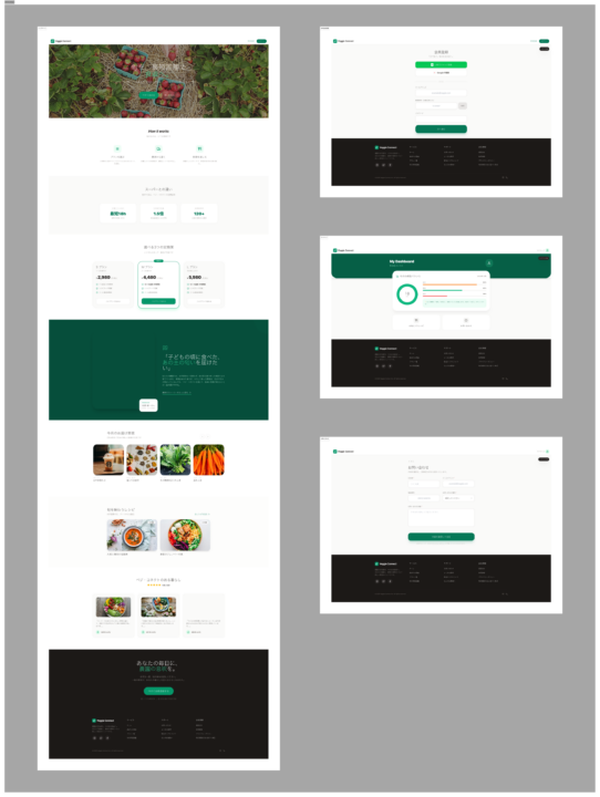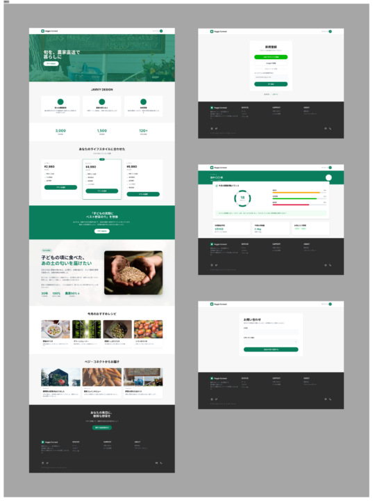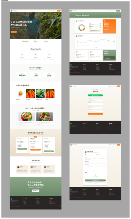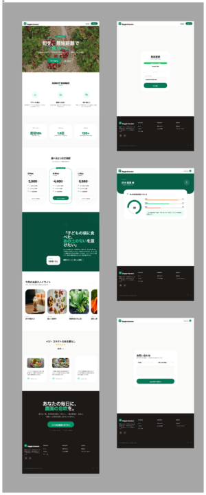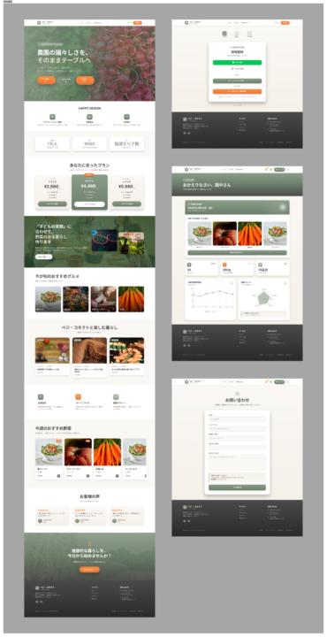 「ベジ・コネクト」のブランドリニューアルに伴い、このLofiワイヤーフレームを最高品質(Hifi)のプロフェッショナルなUIデザインに変換してください。以下の要件をすべて満たす、統一されたデザインシステムを構築すること。 . 【Style System】デザイン指針 ターゲット: 20~30代。豊かさと機能性を求める層。 スタイル: プレミアム・オーガニック・ミニマリズム。洗練された高級感と「農園の瑞々しさ」の融合。 配色(アースカラー): セージグリーン、サンドベージュ、ウォームホワイトを基調とし、アクセントに「シズル感」のあるフレッシュオレンジを採用。 タイポグラフィ: モダンなサンセリフ体を使用。 装飾: 錠剤型(Pill-shaped)のボタン、柔らかな角丸のカード、そして控えめなガラスモーフィズム。 2. 【Functional Layout】構成要素 ヘッダー: 固定型(Sticky)。中央にロゴ、親指で操作しやすい位置にハンバーガーメニューと通知アイコンを配置。 ヒーローエリア(動的切替): ゲスト: 農園の空気感が伝わる「シズル感」溢れる全画面ビジュアル。 会員: ログイン状態を認識し、「次回の配送予定」を最優先で表示。 機能ハイライト: 「品質証明」「パーソナライズ」「健康サポート」をミニマルなアイコンで水平配置。 カテゴリー/商品: 水平スクロールのカードリスト(カルーセル)と、2列のグリッドレイアウト。余白を贅沢に使い、1つひとつの野菜を作品のように見せる。 健康ダッシュボード: 会員向けに野菜摂取履歴をグラフ化(Bento Gridスタイル)。 インテリジェント・フォーム: 入力フィールドにフォーカスした際、その項目をハイライトし、周囲を減光させる「おもてなし」演出(D-2準拠)。 3. 【Technical & UX Rules】 親指フレンドリー: 主要なインタラクションを画面下部〜中央の「Natural Reach Zone」に集約。 パフォーマンス: すべてのビジュアルはWebP品質の軽やかさを感じさせ、Lighthouseスコア90点以上を予感させるクリーンな設計。 アクセシビリティ: WCAG 2.1 Level AAに準拠したカラーコントラストの維持。