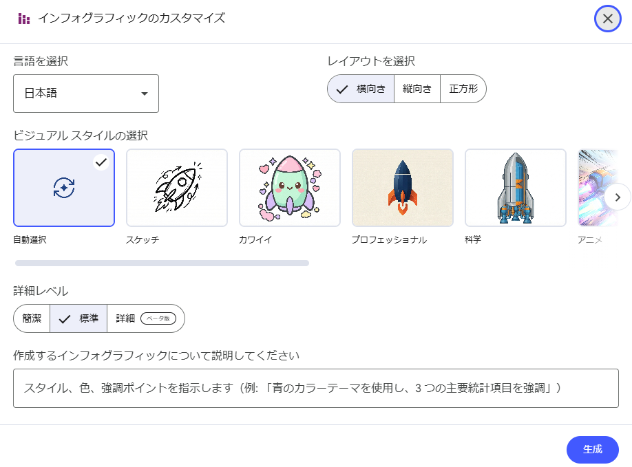・プロンプト入力:作成したいテーマや具体的なイメージ(例:「青を基調にする」「特定の統計を強調する」など)を自由に入力することで、より理想に近い仕上がりになります。