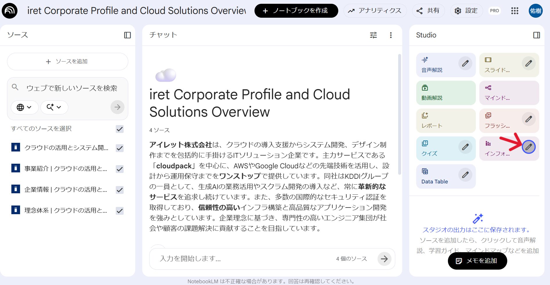 画面右側のStudioパネルにある「インフォグラフィック」の編集アイコン(鉛筆マーク)をクリックして設定編集を開始します。