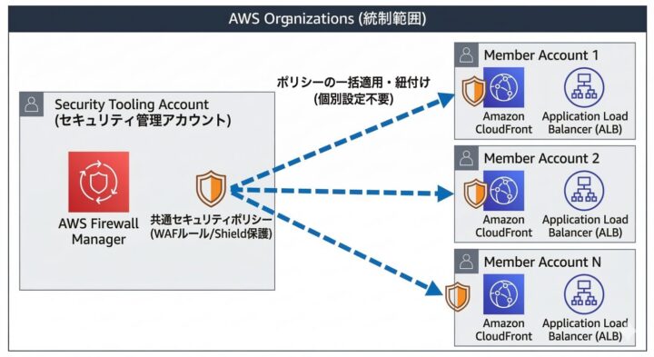 - AWS Firewall Managerによる中央管理: セキュリティ管理アカウントから、組織全体にAWS WAFやAWS Shieldの設定を一括で適用します。