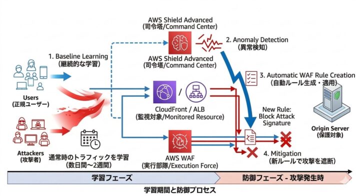 AWS Shield Advanced 最大のメリットは、AIとWAFが連携する「L7自動緩和機能」です。平常時の通信を学習し、異常検知時に「その瞬間の攻撃を止めるルール」を自動生成します。