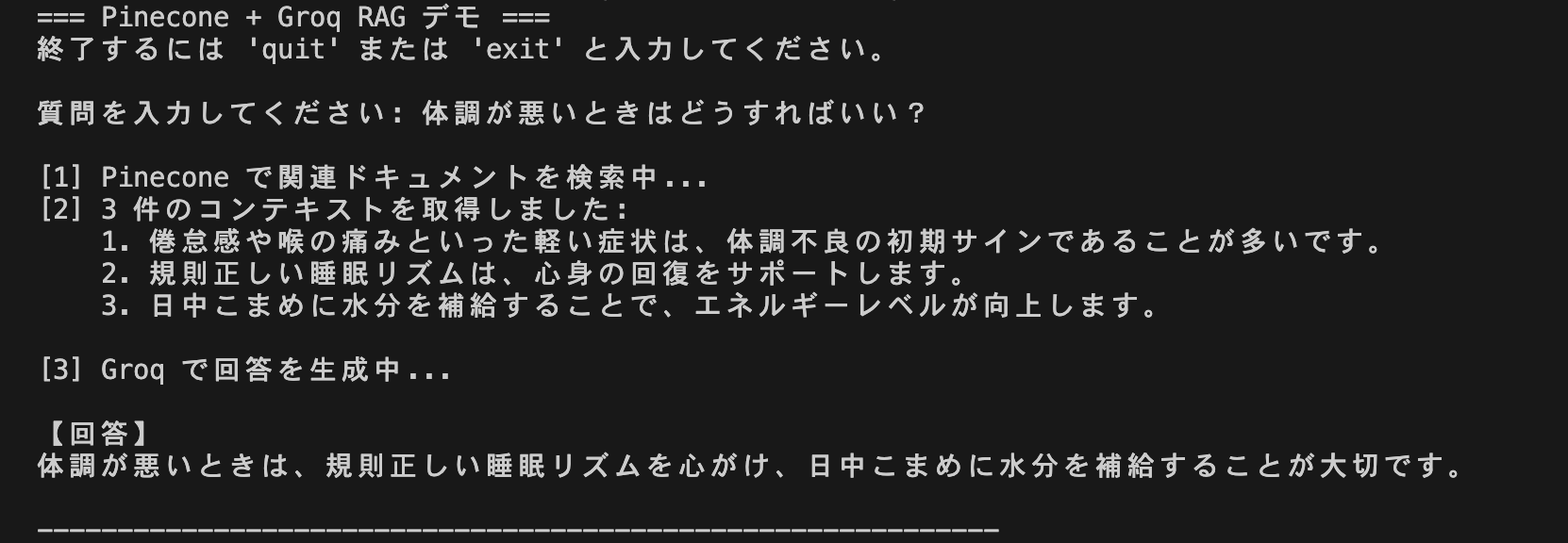 print("=== Pinecone + Groq RAG デモ ===")
