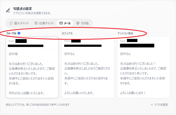 フォーマル / カジュアル / テンション高め の3種類から選択することができます。