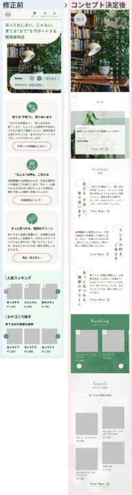 - 「らしさ」を出すためのあしらいは連想ゲームのように考えると良い。例えば、観葉植物店では商品が真っ直ぐではなく高さや奥行きがバラバラに配置されていることが多いため、Web サイトの商品一覧ページも商品カード UI を上下にずらして配置するなど。