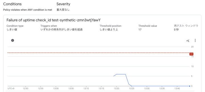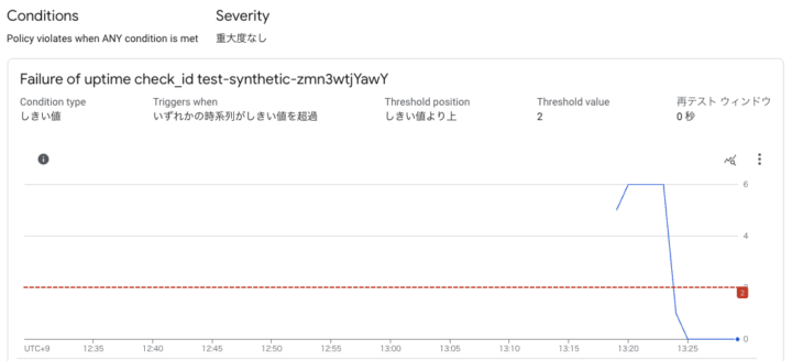 アラートポリシーは合成モニタリングが5分間に3回以上失敗した時発報するように設定しています。
