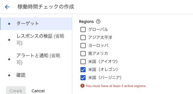 稼働時間チェックであれば、画像のように3リージョンからのみの実行とするように変更することも可能なのですが……