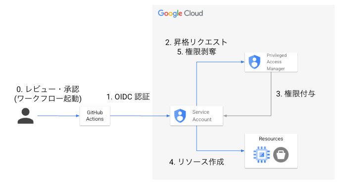 Google Cloud では、Workload Identity (OIDC 認証) を用いて永続的なクレデンシャルを排除するのが一般的ですが、本記事ではさらに一歩踏み込み、Google Cloud Privileged Access Manager (PAM) を活用し、GitHub Actions の実行時のみ一時的に権限を昇格(JIT:Just-In-Time アクセス)するワークフローの実装例をご紹介します。