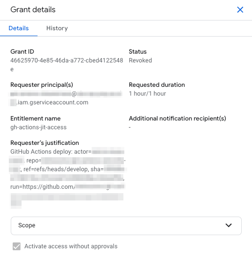 PAM で権限昇格をリクエストする際、--justification 引数に GitHub Actions の実行ユーザーやリポジトリ名を含めています。これにより、Google Cloud 側のログを確認した際に「誰の操作で、どの Actions ワークフローによって、なぜ権限が昇格されたのか」を明確に追跡することが可能になります。