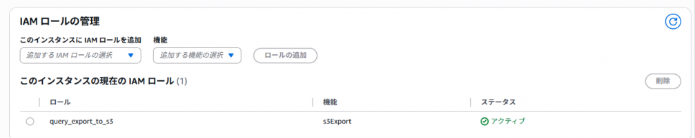 aws rds add-role-to-db-instance \ --db-instance-identifier <DBインスタンス名> \ --feature-name s3Export \ --role-arn arn:aws:iam::<アカウントID>:role/<ロール名> \ --region ap-northeast-1