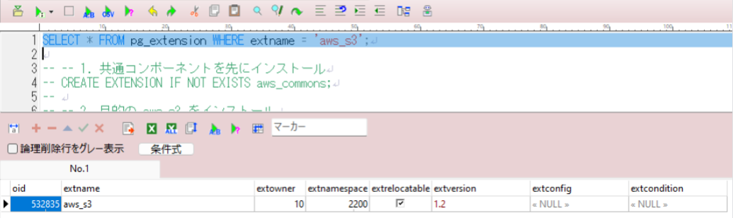 SELECT * FROM pg_extension WHERE extname = 'aws_s3'; -- 1. 共通コンポーネントを先にインストール CREATE EXTENSION IF NOT EXISTS aws_commons; -- 2. aws_s3 をインストール CREATE EXTENSION IF NOT EXISTS aws_s3;