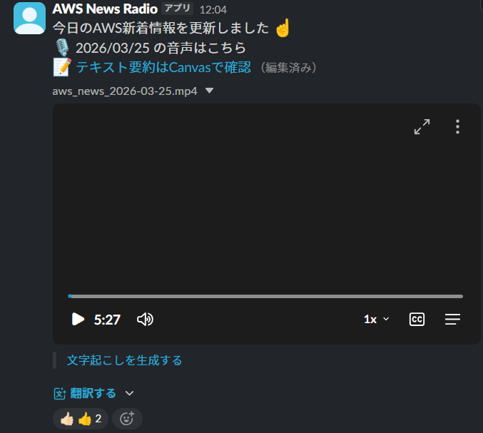 "initial_comment": "今日のAWS新着情報を更新しました\nテキスト要約はCanvasで確認",