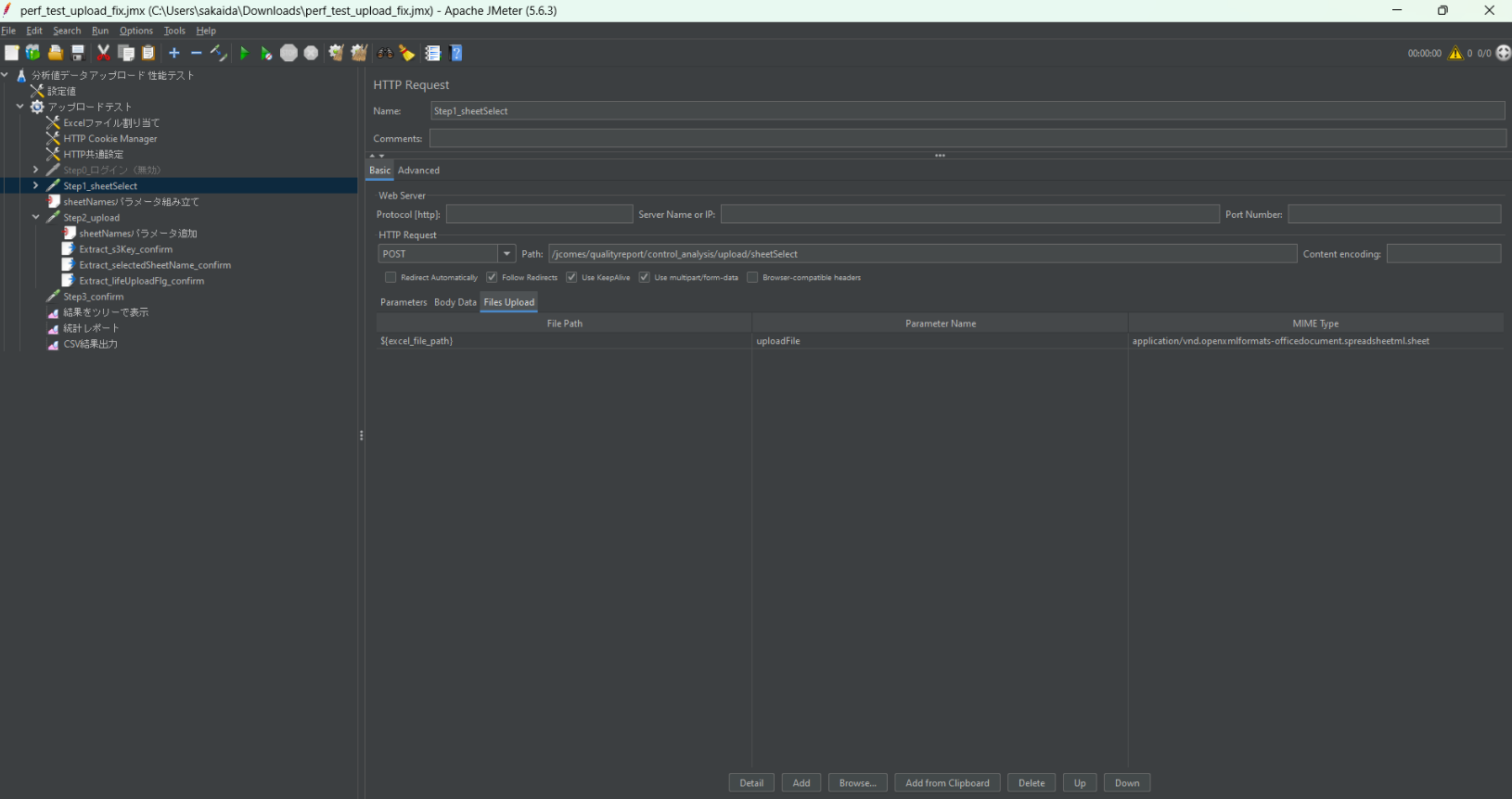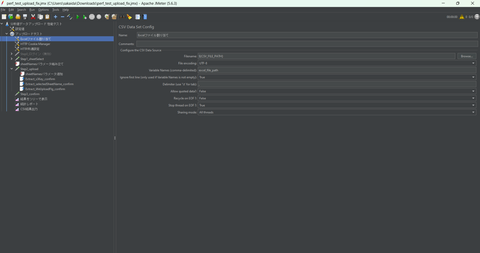 あとはHTTPリクエストのファイルパスに ${excel_file_path} を指定するだけです。スレッド1→1行目、スレッド2→2行目…と自動的に割り当てられます。