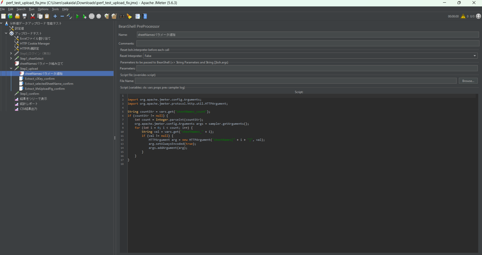 テストプラン ├── ユーザー定義変数(ホスト名, JSESSIONID 等) ├── スレッドグループ(並列度5、ループ1回) │ ├── CSV Data Set Config(ファイル割り当て) │ ├── HTTP Cookie Manager(JSESSIONID) │ ├── HTTP共通設定(ホスト、ポート、プロトコル) │ │ │ ├── Step1【HTTPリクエスト】 │ │ ├── multipart/form-data + ファイルアップロード │ │ └── 正規表現抽出(hidden項目を抽出) │ │ │ ├── Step2【HTTPリクエスト】 │ │ ├── BeanShell PreProcessor(配列パラメータ組み立て) │ │ └── 正規表現抽出(次ステップ用) │ │ │ ├── Step3【HTTPリクエスト】 │ │ │ └── リスナー(結果ツリー、統計レポート)