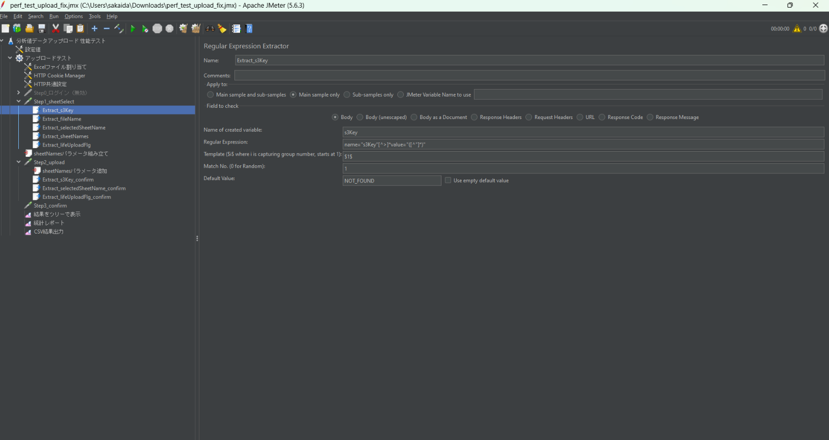 これで上記の例だと value="abc123" の abc123 部分が抽出され、後続のリクエストで ${s3Key} として参照できるようになります。