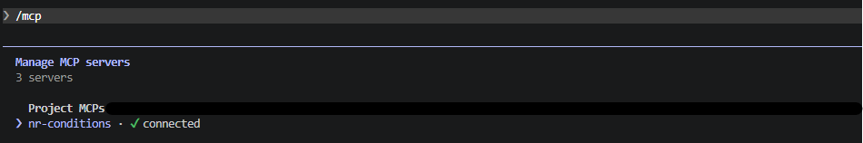 これで内部的には、python3 -m nr_conditions_mcp.serverを実行し、MCPサーバーを起動します。必要な変数が渡されます。