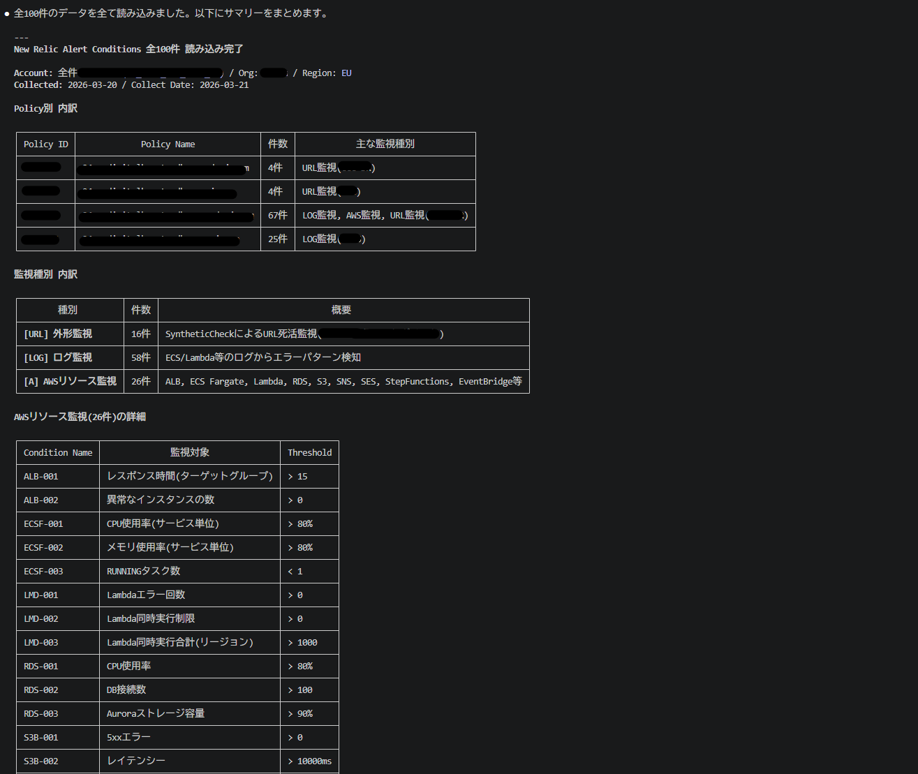 ● 完了しました。Lambda監視の全体像です。 Lambda監視の集計結果 全体サマリ ┌──────────────────┬─────────┐ │ 項目 │ 値 │ ├──────────────────┼─────────┤ │ 総レコード数 │ 338,356 │ ├──────────────────┼─────────┤ │ ユニーク条件数 │ 22,903 │ ├──────────────────┼─────────┤ │ 対象アカウント数 │ 115 │ └──────────────────┴─────────┘ 日付別推移 日付ごとのユニーク条件数は 22,347〜22,695 で安定しており、大きな増減はありません。 アカウント別 TOP10 ┌─────┬───────────────────┬──────────────┐ │ # │ アカウント名 │ Lambda条件数 │ ├─────┼───────────────────┼──────────────┤ │ 1 │ xx_x-xxxx_xxx │ 4,893 │ ├─────┼───────────────────┼──────────────┤ │ 2 │ xx_xxxxxxxx_xxx │ 1,530 │ ├─────┼───────────────────┼──────────────┤ │ 3 │ xx-xxxxx_xxxxxxx │ 1,299 │ ├─────┼───────────────────┼──────────────┤ │ 4 │ xx-xxxxx_xxxxxx │ 1,268 │ ├─────┼───────────────────┼──────────────┤ │ 5 │ xx_xxxx │ 1,258 │ ├─────┼───────────────────┼──────────────┤ │ 6 │ xx-xxxxxxx_xxxxxx │ 770 │ ├─────┼───────────────────┼──────────────┤ │ 7 │ xx_x-xxxx_xxx │ 717 │ ├─────┼───────────────────┼──────────────┤ │ 8 │ xx-xxxx_xxxxxx │ 462 │ ├─────┼───────────────────┼──────────────┤ │ 9 │ xx_xxx_xxxx │ 438 │ ├─────┼───────────────────┼──────────────┤ │ 10 │ xx-xxxxxxx_xxxxxx │ 438 │ └─────┴───────────────────┴──────────────┘ xx_x-xxxx_xxx が圧倒的に多く、Lambda監視全体の約21%を占めています。 ログは no-guard-log_03281400.txt に記録しました。