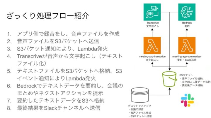 技術構成は Node.js 製のデスクトップアプリと AWS 上の Lambda、Transcribe、Bedrock で構成。AI モデルには高速な処理速度と低価格を理由に Claude 3 Haiku を選択しています!