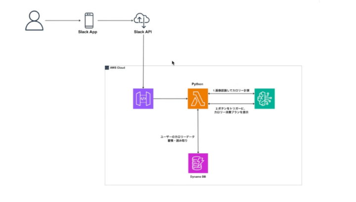 技術構成は AWS Lambda(Python)、Amazon API Gateway、Amazon DynamoDB、そして画像分析に Amazon Bedrock 経由の Claude 3.5 Sonnet を使用。デモでは、ポテトチップスの画像から摂取カロリーと残りの摂取可能カロリーを推定し、トレーナーからのポジティブなコメント付きレポートを約5〜6秒で出力してみせました。