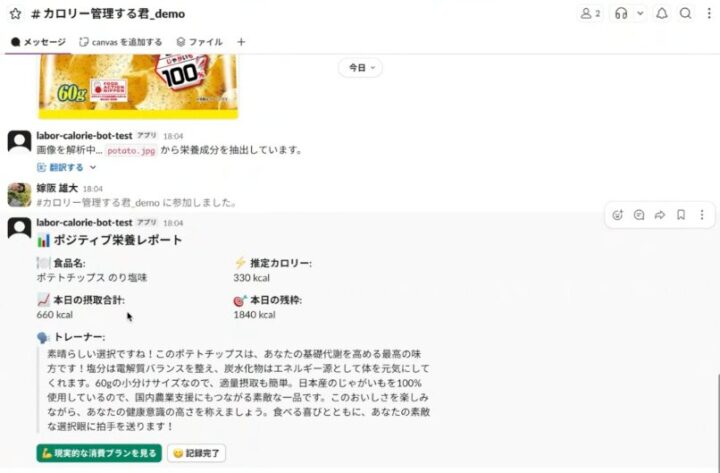 使い方はユニークで、Slack に料理の画像を投稿すると AI がカロリーを分析。ユーザー別の摂取カロリー記録と残り摂取可能カロリーの計算、さらにカロリー消費量に応じた運動プランまで提示してくれます。