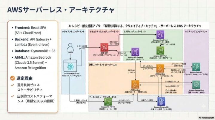 アーキテクチャはモダンな AWS サーバーレス構成で、フロントエンドは React(Amazon S3)、バックエンドは Amazon API Gateway と AWS Lambda(Node.js)。レシピ生成にはコスト効率を考慮し Amazon Bedrock の Claude 3.5 Sonnet を使用しています。
