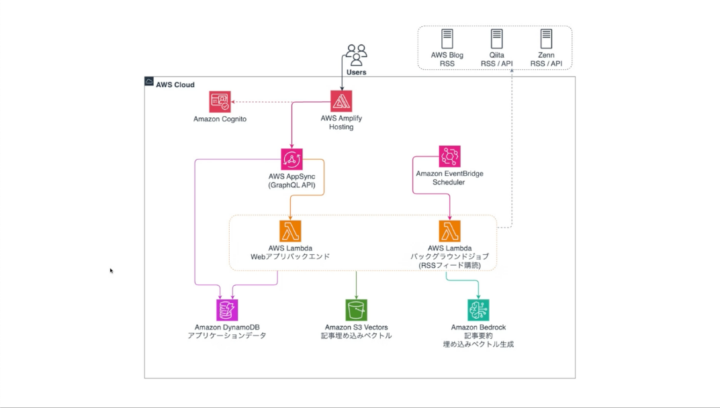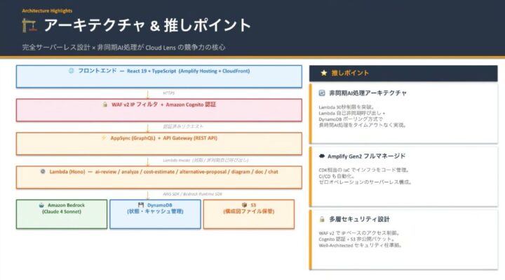 フロントエンドは React、バックエンドは AWS AppSync、AWS Lambda、Amazon Bedrock(Claude 3.5 Sonnet)で構成。AppSync Gen2 によるフルマネージド化で全メンバーが AI 駆動開発に集中できる環境を実現していました。