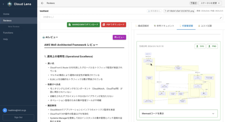 クラウドレンズは、AWS 構成図をアップロードすると AI が Well-Architected Framework に沿ってレビューし、コスト見積もり、改善案、代替案の提案、そして提案資料を PDF で即座に出力する多機能なアプリケーションです。