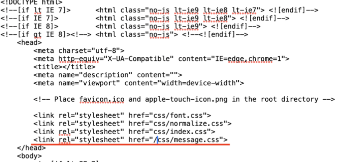 19行目のlink rel="stylesheet" href="/css/message.css"を探して先頭ににあるスラッシュを削除し、href="css/message.css" に書き換えます。