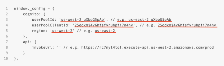 2.「js」>「config.js」をテキストエディットで開きます。下記を先ほど取得した値に書き換えます。画像では2箇所に同じ値を入れていますが、「//」の後ろはコメントなので消してしまっても問題ありません。