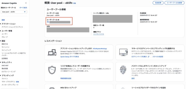 7.「ユーザープールIDを控えます。どこかにメモしておきましょう。