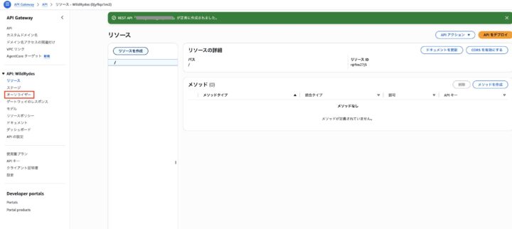 5.3本線の左側のタブから「オーソライザー」>先ほど作成した「WildRydes」を選択します。