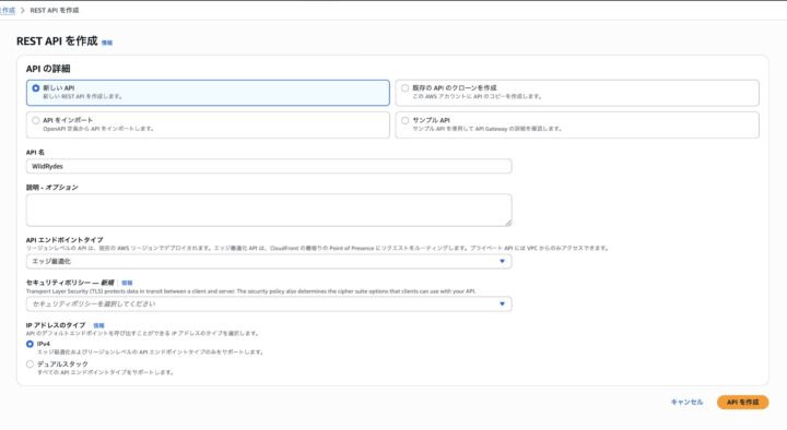 4.下記設定を選択し、「APIを作成」を選択します。