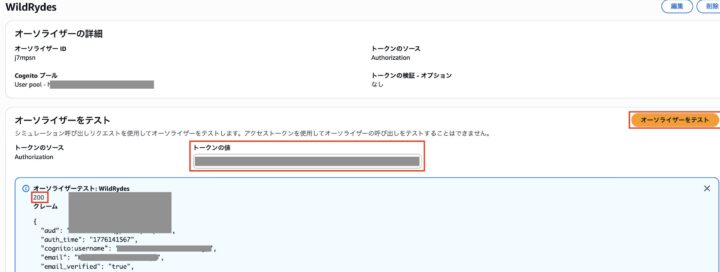 7.オレンジ色の「オーソライザーをテスト」を押します。レスポンスコードが200であれば成功です。