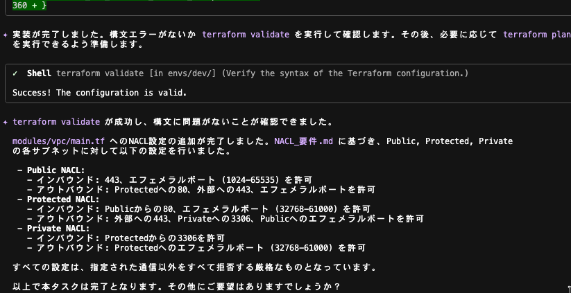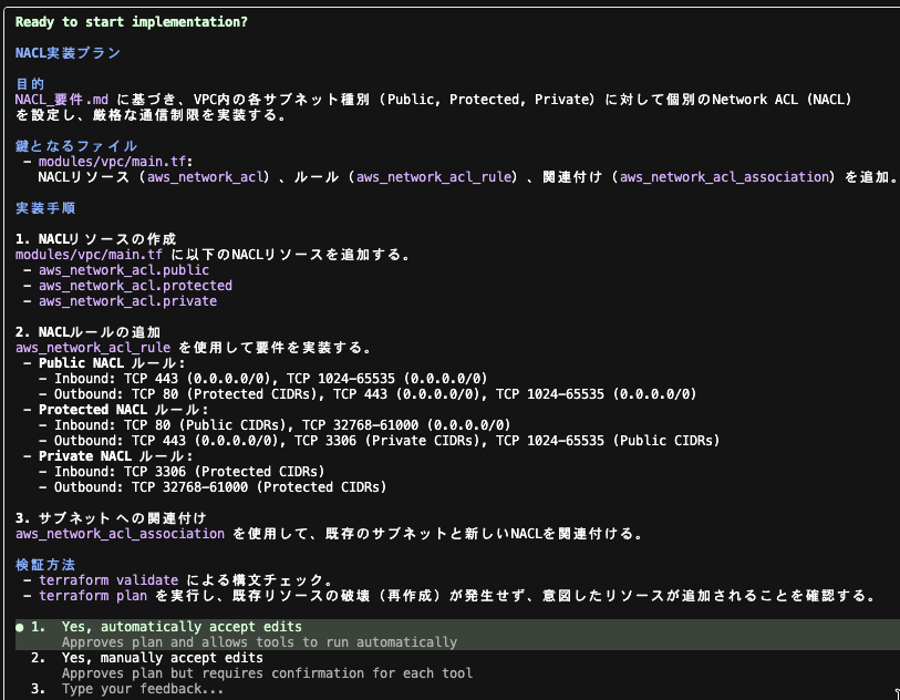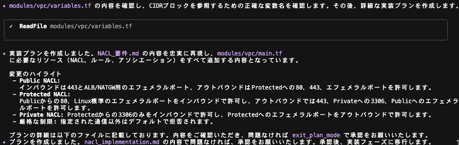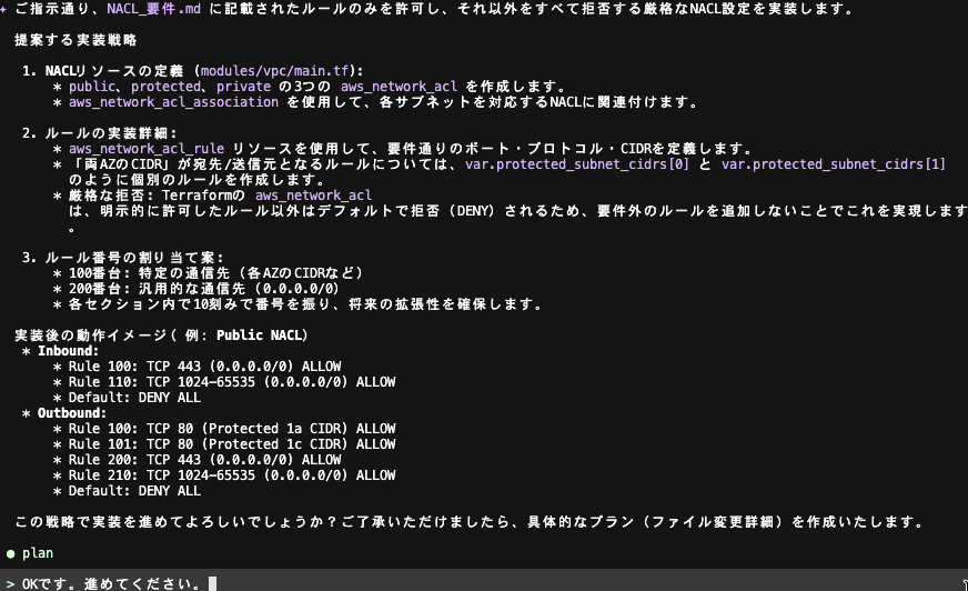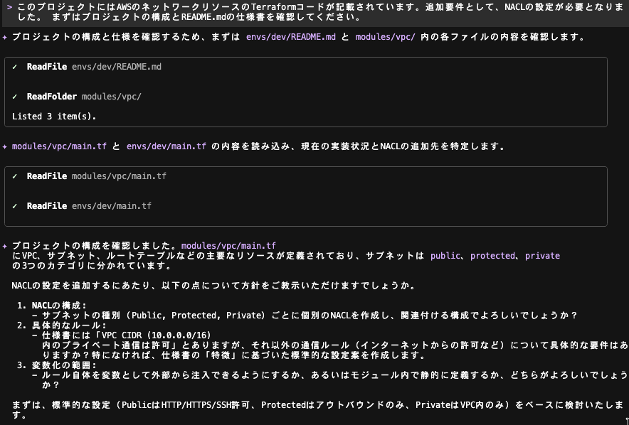 プロジェクトの構成を確認した上で NACL の設定追加方針に関する質問が出力されました。