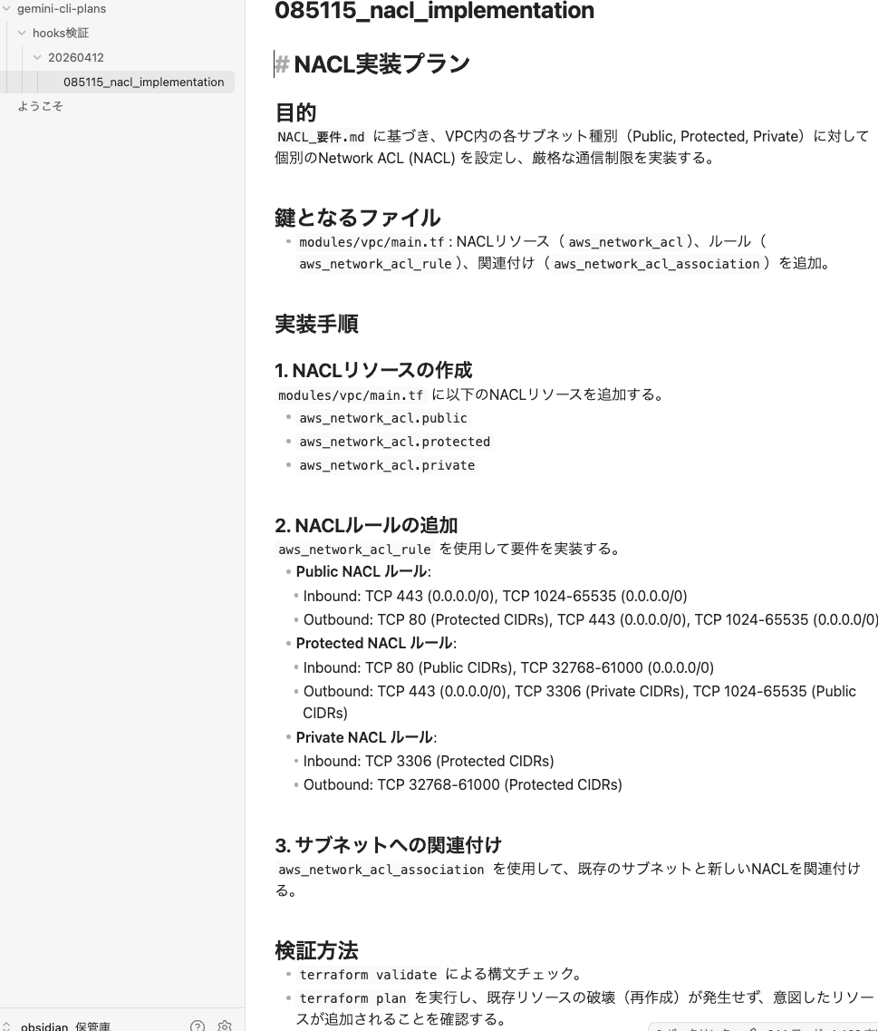この実装計画ファイルですが、隠しフォルダ内に格納している状態だと手軽に参照し難いため、hooks 機能を活用することで Obsidian の保管庫にコピーし、参照しやすい形とする方法を紹介します。