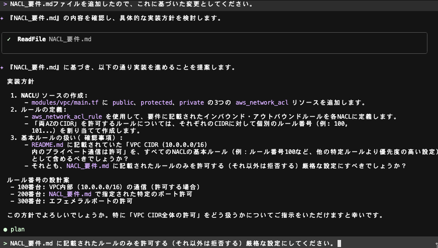 NACL の追加方針をまとめた Markdown ファイルをプロジェクトに追加し、その内容に基づく対応とする指示をユーザープロンプトに入力します。