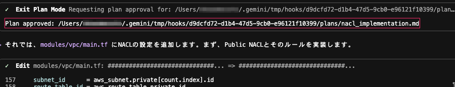 本ブログの趣旨は hooks を活用した実装計画ファイルのコピー方法の紹介となるので、Plan Mode で作成された実装計画ファイルが追加要件を満たしているか、実装計画ファイルを元に変更、作成された AWS リソースや Terraform コードが追加要件を満たしているかの確認は省略します。