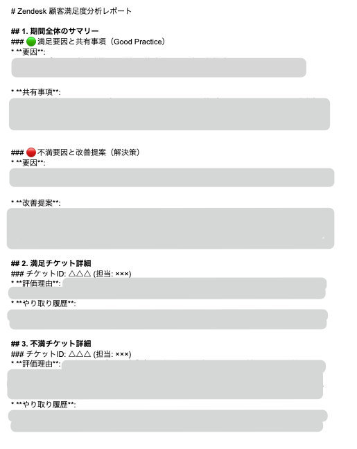 ※本来であれば、担当者名・お客様・チケットID、チケット内容、AI分析内容などの詳細情報も出力されますが、個人情報であるためマスキングしております。