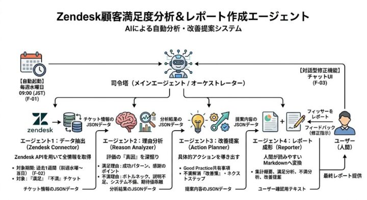 本システムは、Zendeskのチケット評価(満足・不満)を毎週自動で収集・分析し、改善提案を含むレポートを作成するものである。