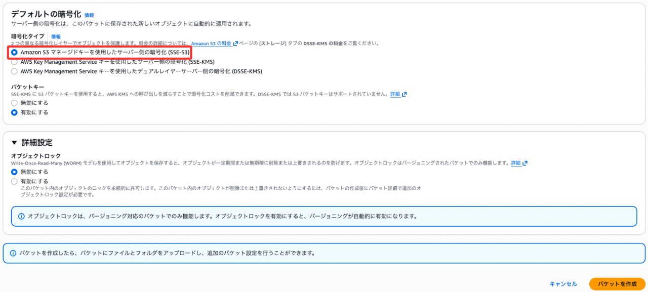 - 暗号化:Amazon S3 マネージドキー(SSE-S3)を選択(SSE-KMSは非対応)