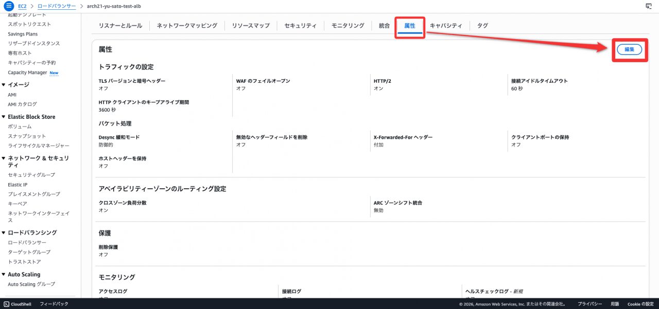 - 対象ALBを選択し、「属性」タブ を「編集」