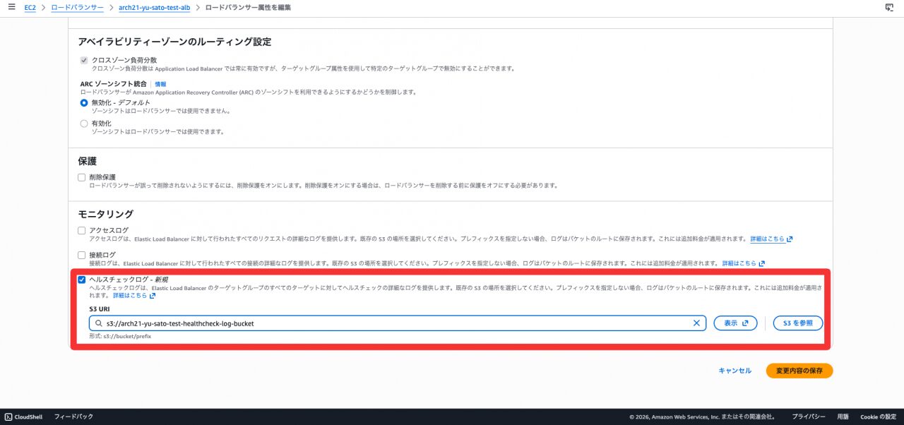 - 「ヘルスチェックログ」 を有効化し、S3バケットを指定