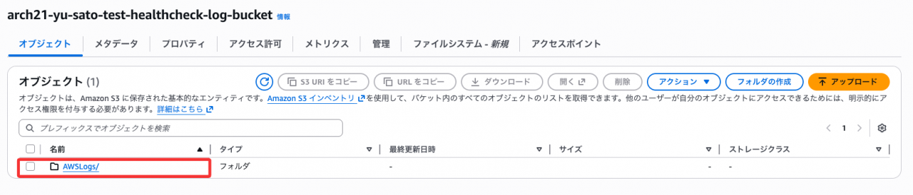 ヘルスチェックログを有効にするとALBがS3バケットを検証し、テストファイルを自動的に作成します。このファイルが作成されていれば、バケットポリシーが正しく設定されていることが確認できます。