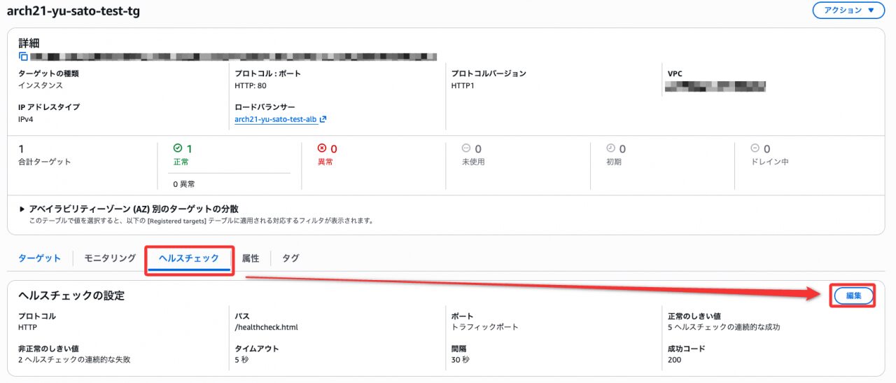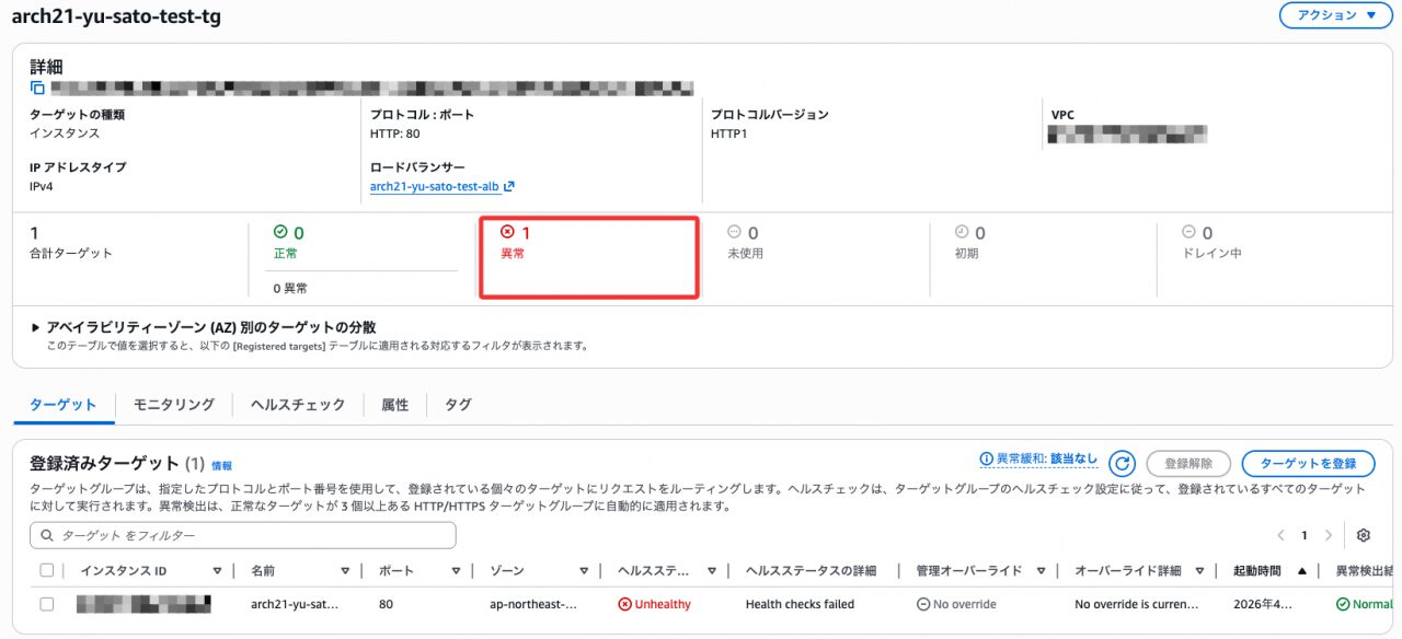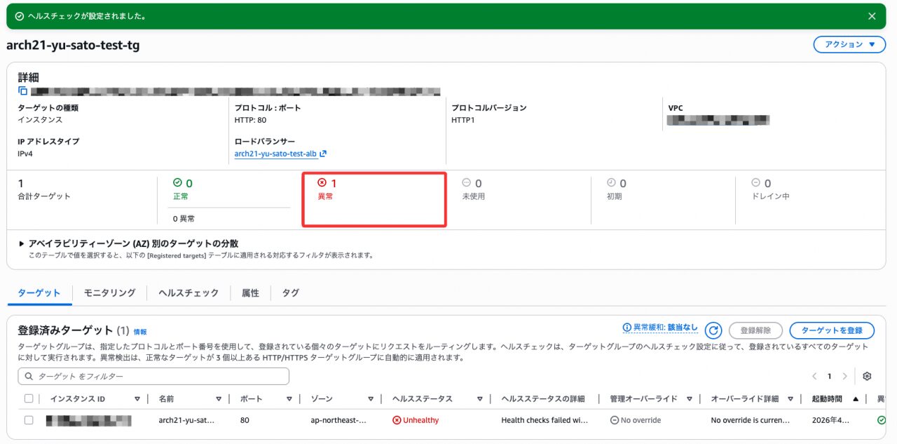変更後、ターゲットグループのステータスが Unhealthy に変わったことを確認しました。