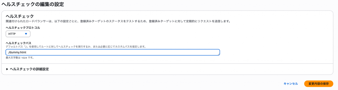 ヘルスチェックパスを /healthcheck.html → /dummy.html(存在しない)に変更します。