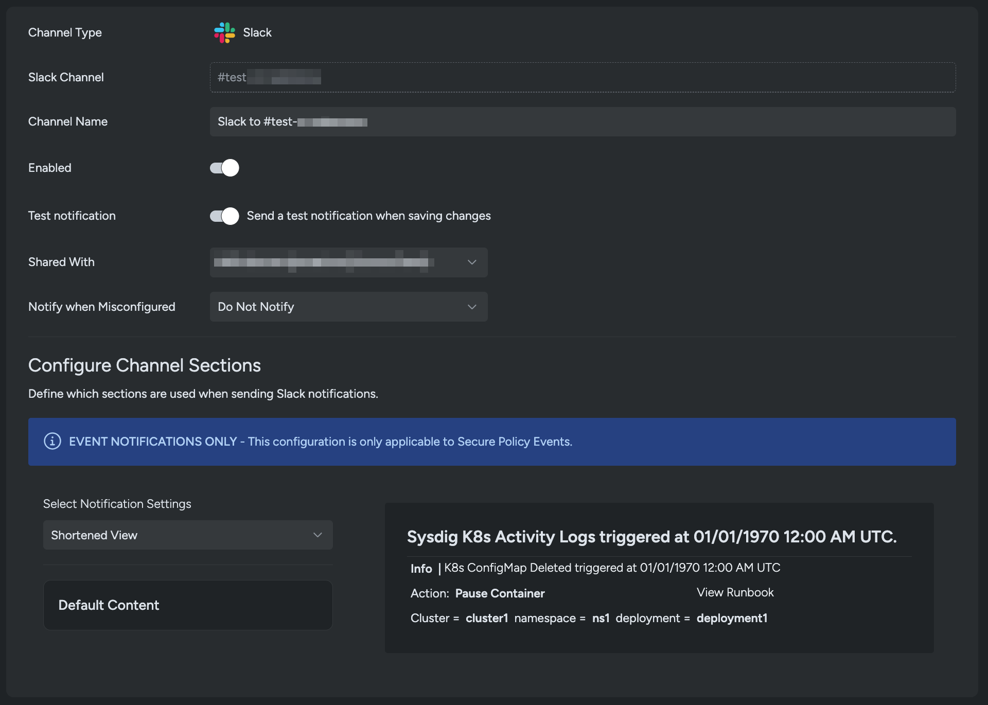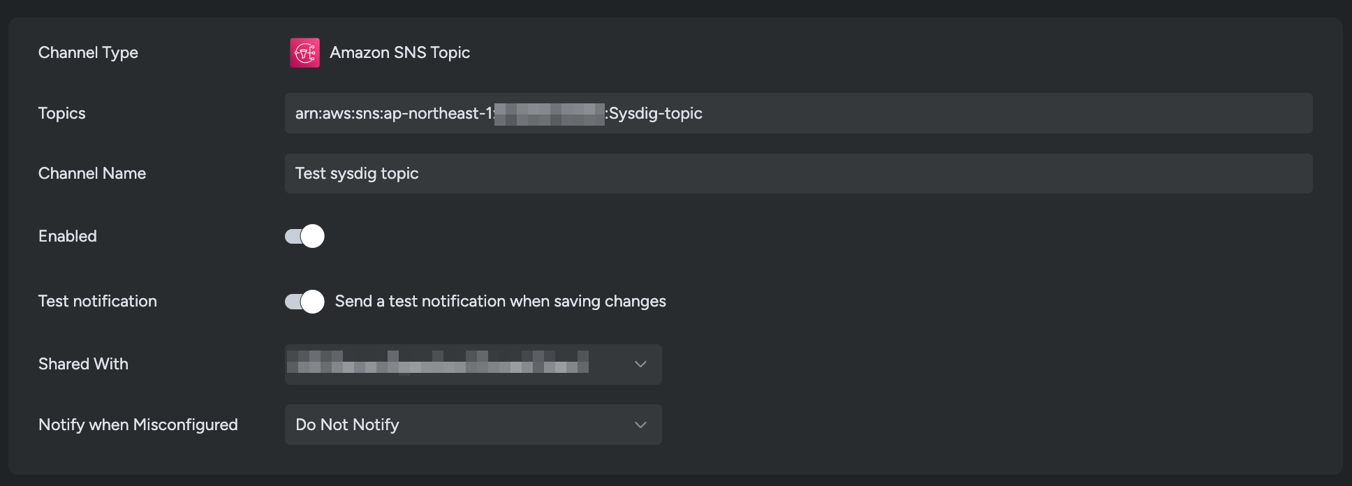 Sysdig では、Notification Channel として Mail だけでなく、Slack や Microsoft Teams といったコミュニケーションツールのほか、PagerDuty、Amazon SNS、WebHook などに通知することが可能です。