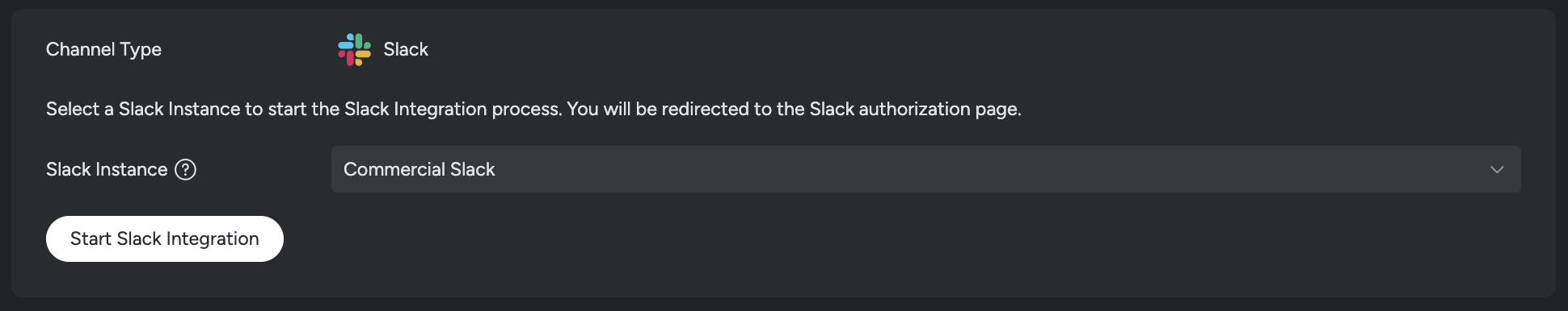 Slack instance に Commercial Slack を選択して、Start Slack Integration を選択します。