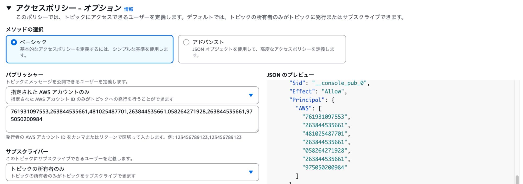 Topic 作成時のアクセスポリシーで、パブリッシャーを選択して、指定された AWS アカウントのみを選択。