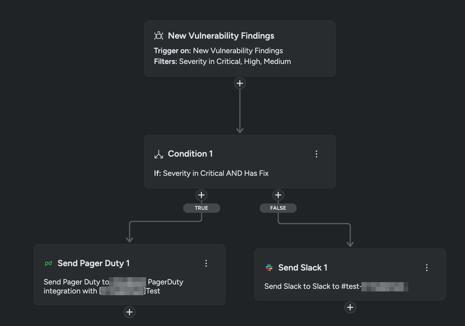 『Case 1: 緊急性の高い脆弱性に対して、自動起票』を例にして、先に作成した Slack と PagerDuty に通知します。