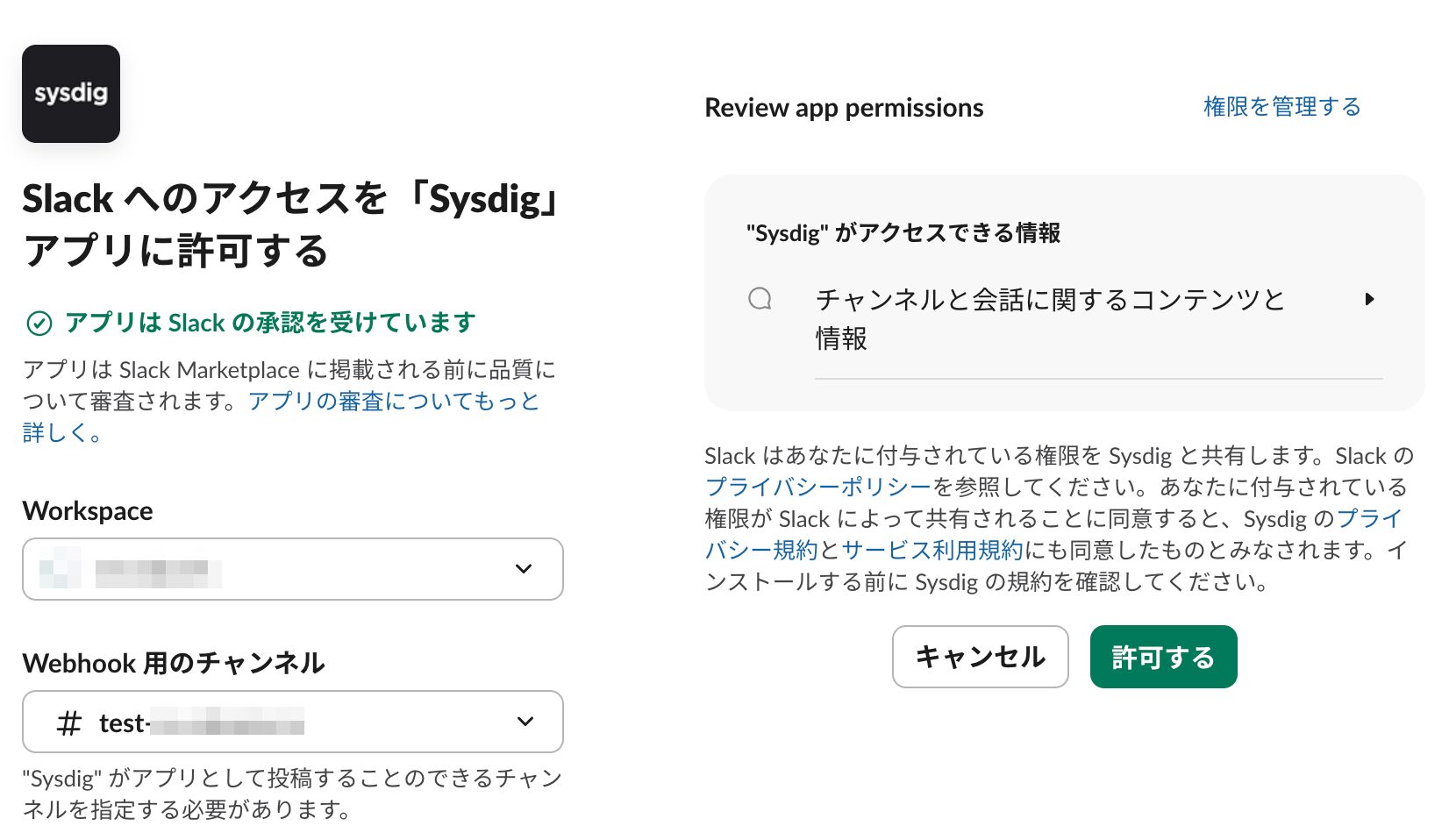 その後、連携する Workspace および、Webhook 用チャンネルを選択して、許可をします。